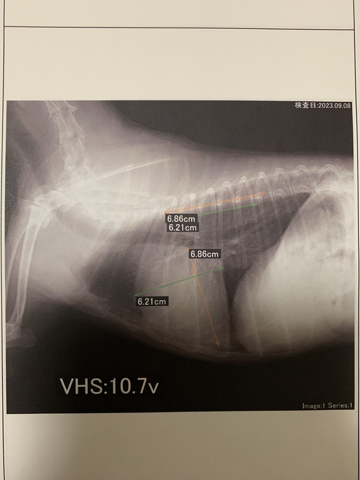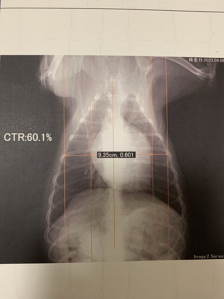 レントゲン写真では、心臓が肥大しており、クラスb2の(心不全発症)直前レベルである事も分かりました。 心臓から送りだす血液には逆流が見られ