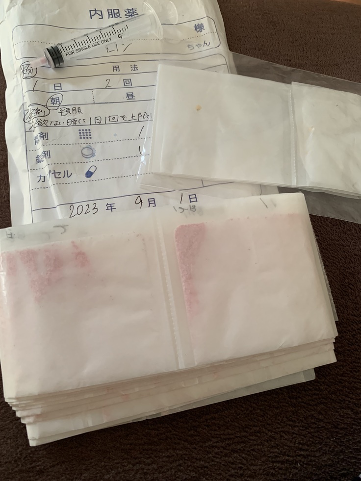 肺水腫になると、肺に水がたまり呼吸が凄く苦しくなります。ですので、肺水腫にならないよう利尿剤入のお薬を飲ませています。