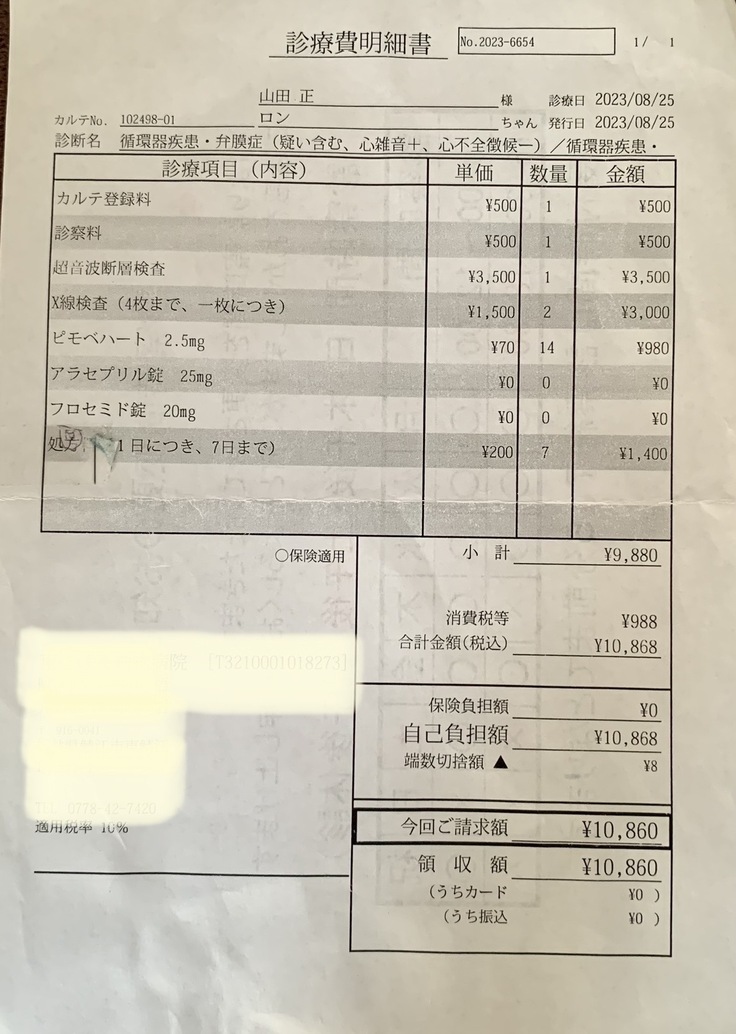 愛犬のロンに体調不良が出始めたのが今年の7月頃になります。咳が出始めたので、おかしいと思い行きつけの動物病院に連れていったのですが、検査すらしてくれずに、話だけを聞いて「高血圧ですね!血圧を下げるお薬を出します」と言われ、そこから1ヶ月半 薬を飲み続けるも全く良くなりませんでした。