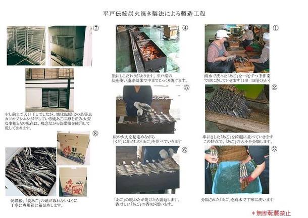 現在、流通している「あごだし」として販売されている物の95%は、パック入りや顆粒状の風味調味料と言われる商品です。(これが悪いと否定する訳ではありません)私は、江戸時代から続く伝統製法平戸伝統炭火焼あごを多くの方に知っていただきたいと思っております。