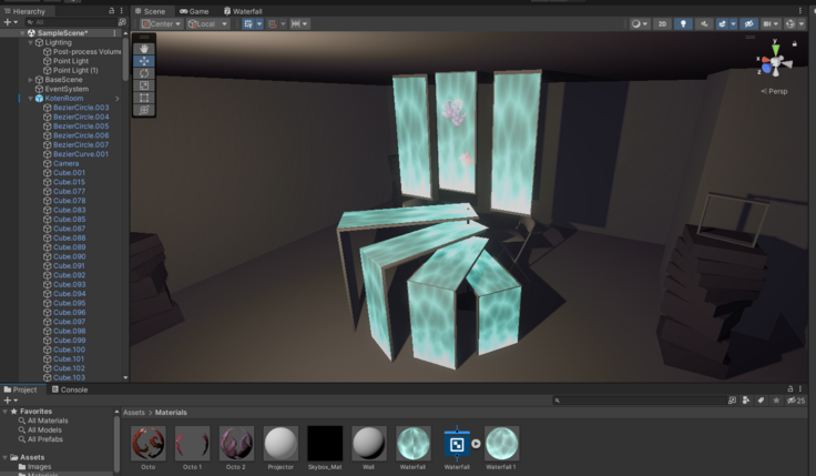これを元に、個展会場の図面や目視の情報を元に作ったバーチャルオクロジに、実際に部屋の中に瀧があるかのようなアニメーションを準備しています!