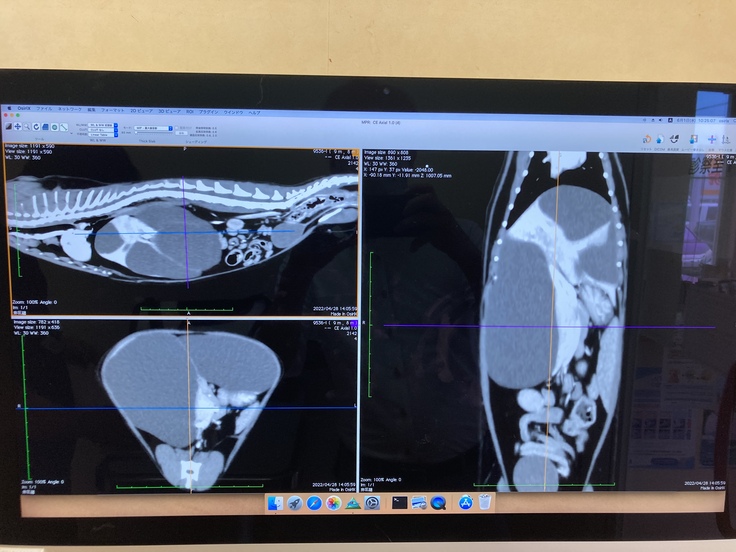 通常の肝嚢胞であれば、一部の肝臓と嚢胞を切除して、正常な肝臓を残せばそこが成長して元通りになるのですが、モネは肝臓全体に嚢胞が複数あるので、嚢胞だけを切除しなければならず、また症例がないのでお腹を開けてみないと分からないことが多くリスクがあるようでした。しかし、このまま放っておくと嚢胞が破裂や他の臓器を圧迫してしまう危険性がありました。