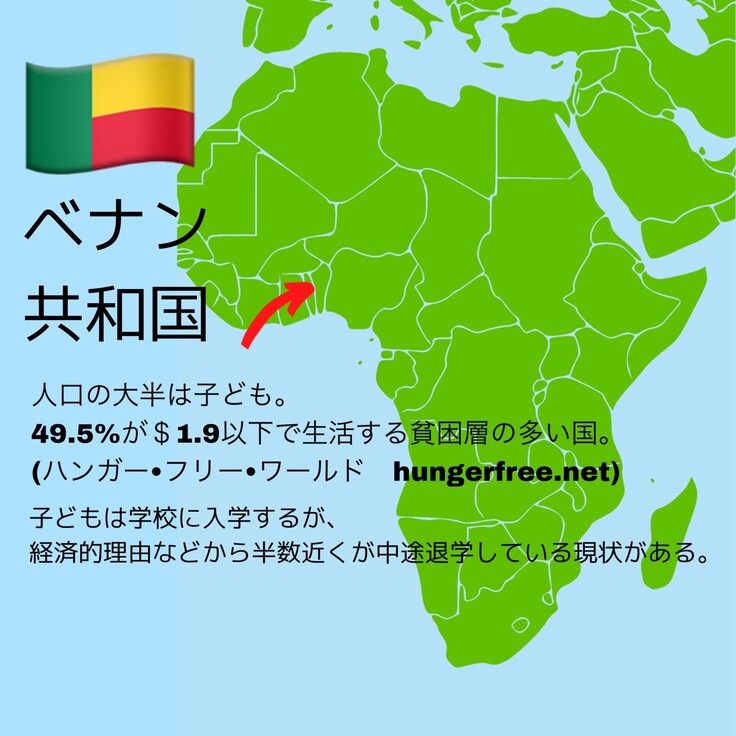 ベナンでは公立小学校の学費は無料です。しかし、学習物品(ユニフォーム、カバン、靴、ノートなど)を揃えるためのお金や、午前中の休憩時間に子どもたちは軽食を食べるのですが1日10〜25円必要になってきます。