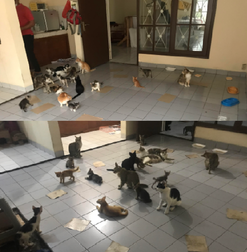 インドネシアでは、首都ジャカルタ近郊に、キャットシェルターがいくつかありますが、一日のうち多くの時間を檻や狭い部屋に閉じ込めているケースがいくつかありました。