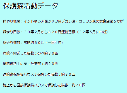 これまでは、こうした費用だけでなく、毎日の餌代、診療費や保護猫ハウスの賃貸費用、更にはファイザルさんの手当てなどすべて自費で賄ってきましたが、規模拡大とともに既に限界に達しており、皆様のご支援を募るものです。