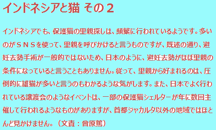 仕事の関係で30代からインドネシアに滞在して通算15年くらいになります。今回4回目の滞在となりますが、ちょうど3年位前から、週末など余暇を使って、当地の路上猫たちとの付き合いを始めました。(現在帰国中です)