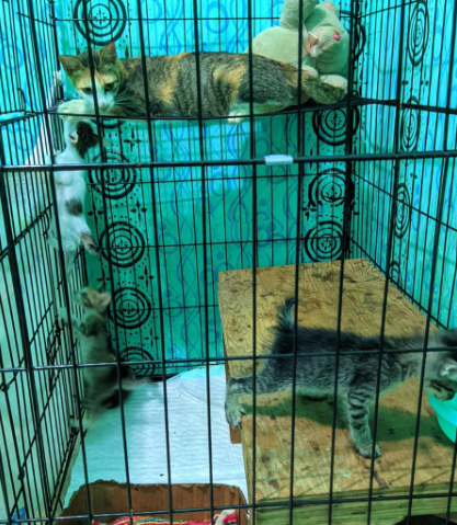 2.ナツは病み上がりのため、余りミルクをあげられません。子供達はとても元気で、ママ目掛けて金網をよじ登っています。Just recovered from the disease, Natsu cannot give sufficient milk for her kids, but they are active, climbing the iron fence up to their mother Natsu in the cage here.
