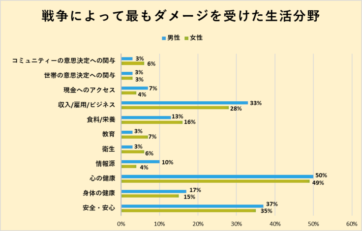 * 戦争の前から見られたジェンダー不平等はさらに悪化し、女性の無償ケアの負担が増しました。
