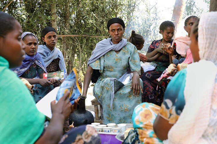 エチオピアのアムハラ地方のグバラフトにコーヒーを飲みに集まる女性たち。これらの「コーヒーコーナー」イベントには、紛争の影響を受けて、心理社会的、法的、医学的支援を提供できるサービスプロバイダーを必要としている女性と少女が集まりました。