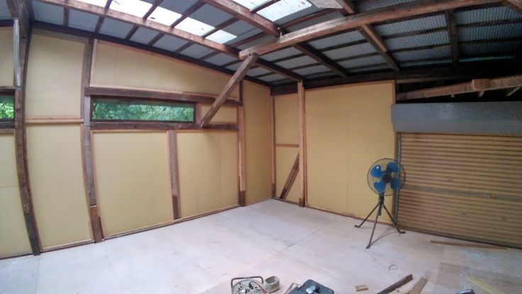 壁面も断熱材が充填され、化粧の石膏ボードも貼られ、作業場として使用する環境が着々と整ってきました。