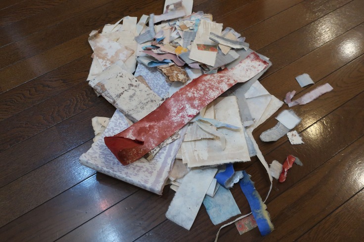 貼り終わった箇所の床を見ると染描紙の切れ端が、、、