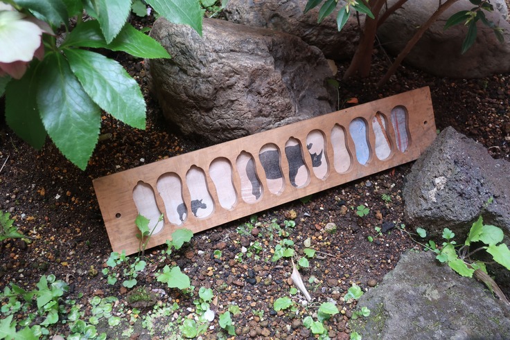 菓子型の模様が合間って、木々の中をサイの親子が歩いているような可愛らしい作品です。