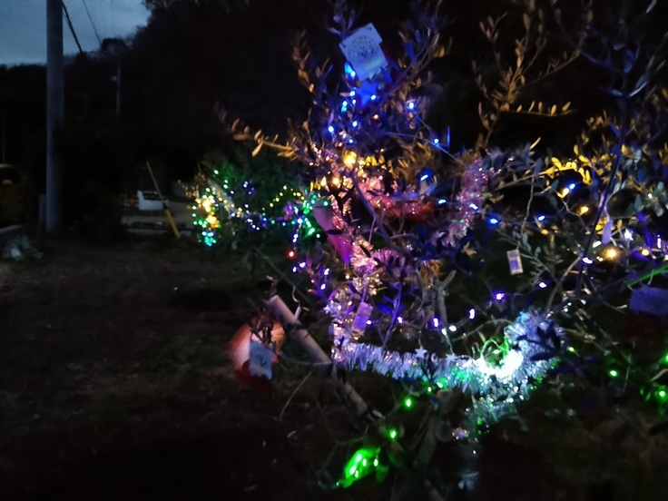 オーナメントや風船を飾って 夜になる前に飾り終わり、夕方の薄暗くなったところで点灯。畑でのいつもと違う半日は、とても楽しかったようです。