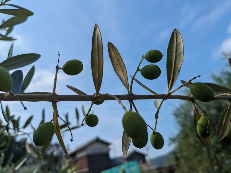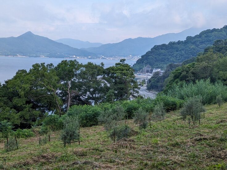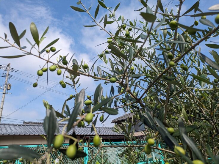 二十四の瞳映画村に続く海岸通りのオリーブの木は今年でまる4年と3年が過ぎました。背丈は驚くほど大きくなり、初めて沢山の実をつけています。