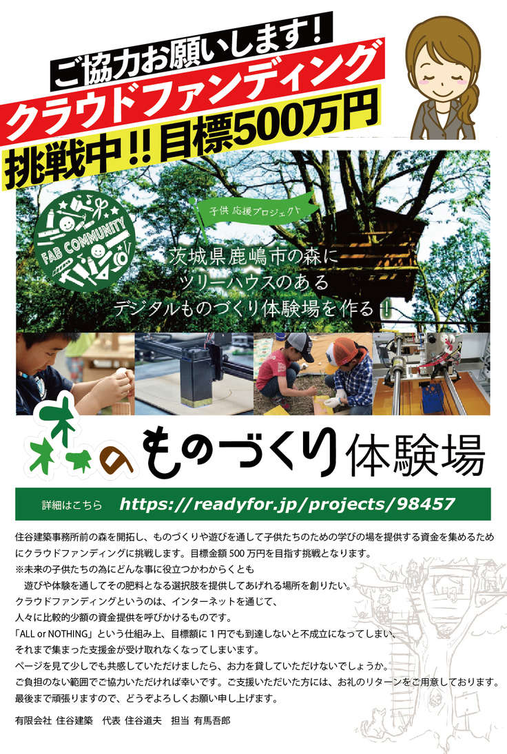 (有)住谷建築がツリーハウスを建築し、デジタルものづくりの場を提供します。集まった資金は土地購入費100万円・デジタル工作機器購入費200万円・ツリーハウス建築費100万円・森の造成工事費用100万に使用します。