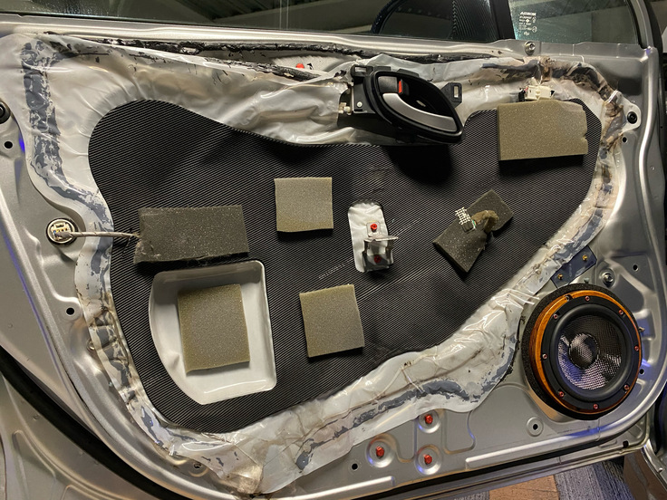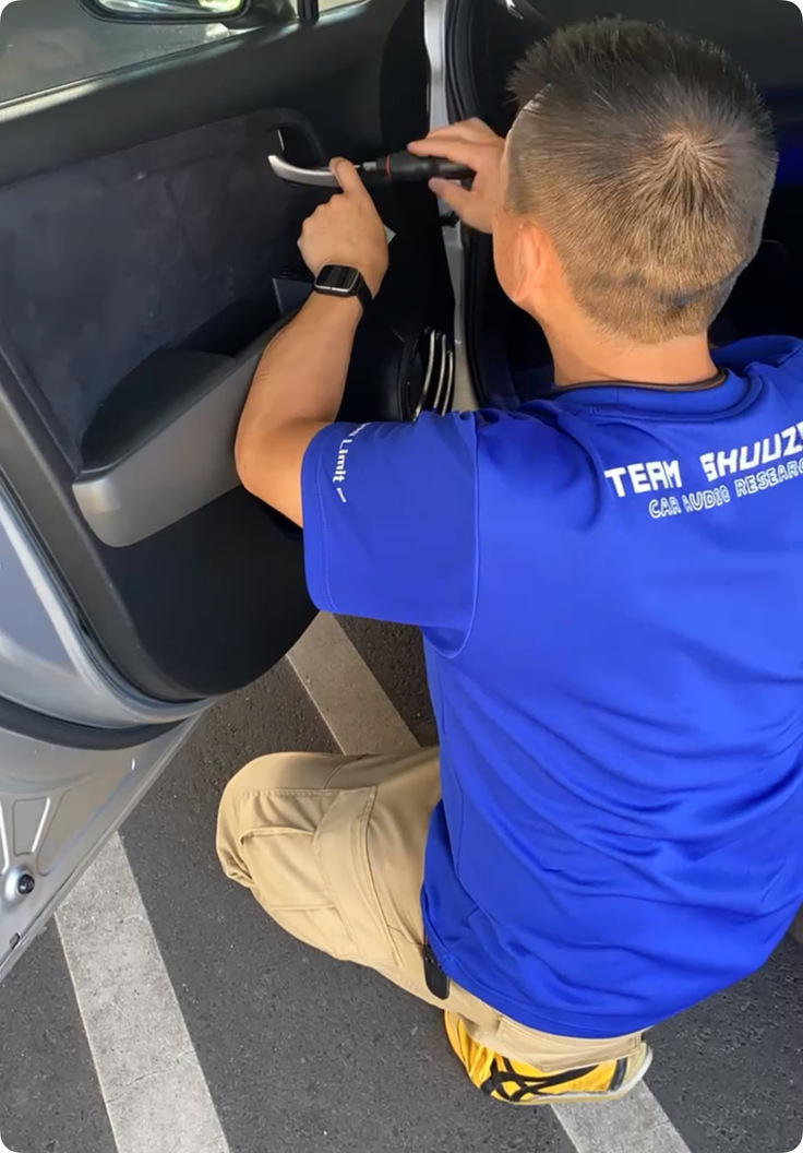 弊社では、一般的に必須と言われているドアのサービスホールと言われる穴を重量の有る制振材などで塞ぐ、いわゆるデッドニングが不必要かも知れない?と考えています!これは、以前、私が所有していた研究用の車が、大量に使用した各所に貼った制振材や大型なオーディオ機材や電源ケーブル等の大幅な重量増による悪影響を受けた為に、車としての走行性能を犠牲にした経験から、本当に必要最低限の機材により構成しております。