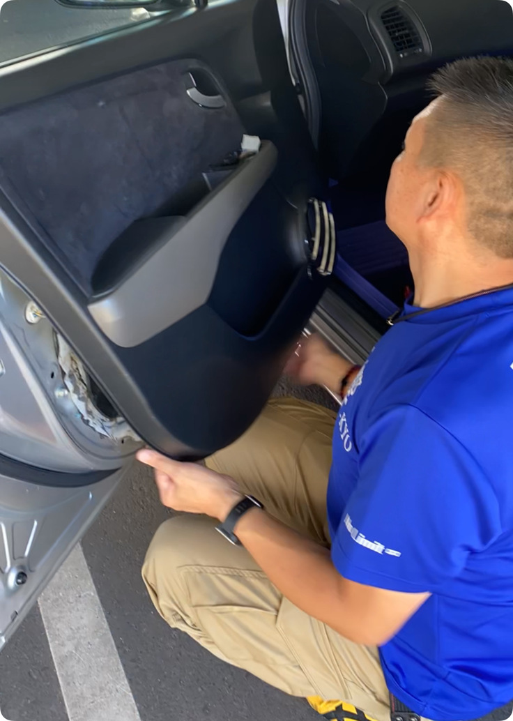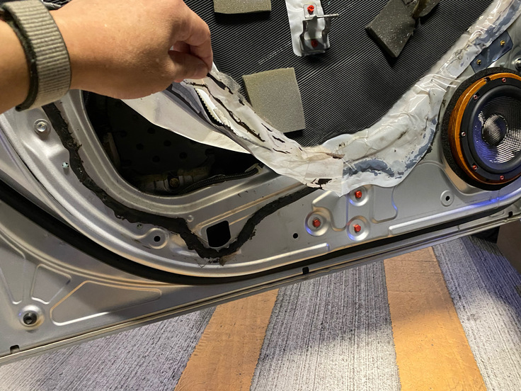 弊社、轟響デモカーにもデッドニングをしていませんので、この様に純正の防水ビニールシートを簡単にめくることができ、『万が一のドア内部修理などのメンテナンス作業』を妨げる事もありません!