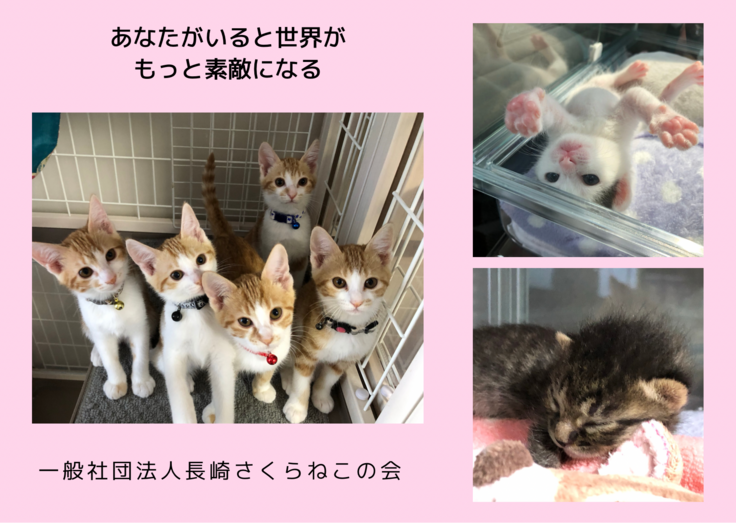 仲間が少しづつ増えました。2022年3月22日に一般社団法人長崎さくらねこの会として新たにスタート致しました。現在も不妊化に力を入れて「地域猫サポーター」や「ねこの里親譲渡会」を開き、保護した猫たちの譲渡をすすめる場を作ったり、ミルクボランティアで小さな命を繋いだりしています。