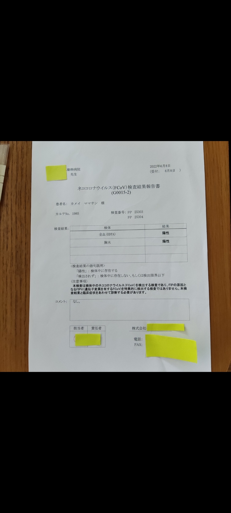 残念ながら日本では.FIPに対する効果的な治療方法はなく..なるべく苦しまないように延命処置をするだけであり..水が溜まればお腹や胸に針を指し.薬を使って血管炎を抑えるだけです。