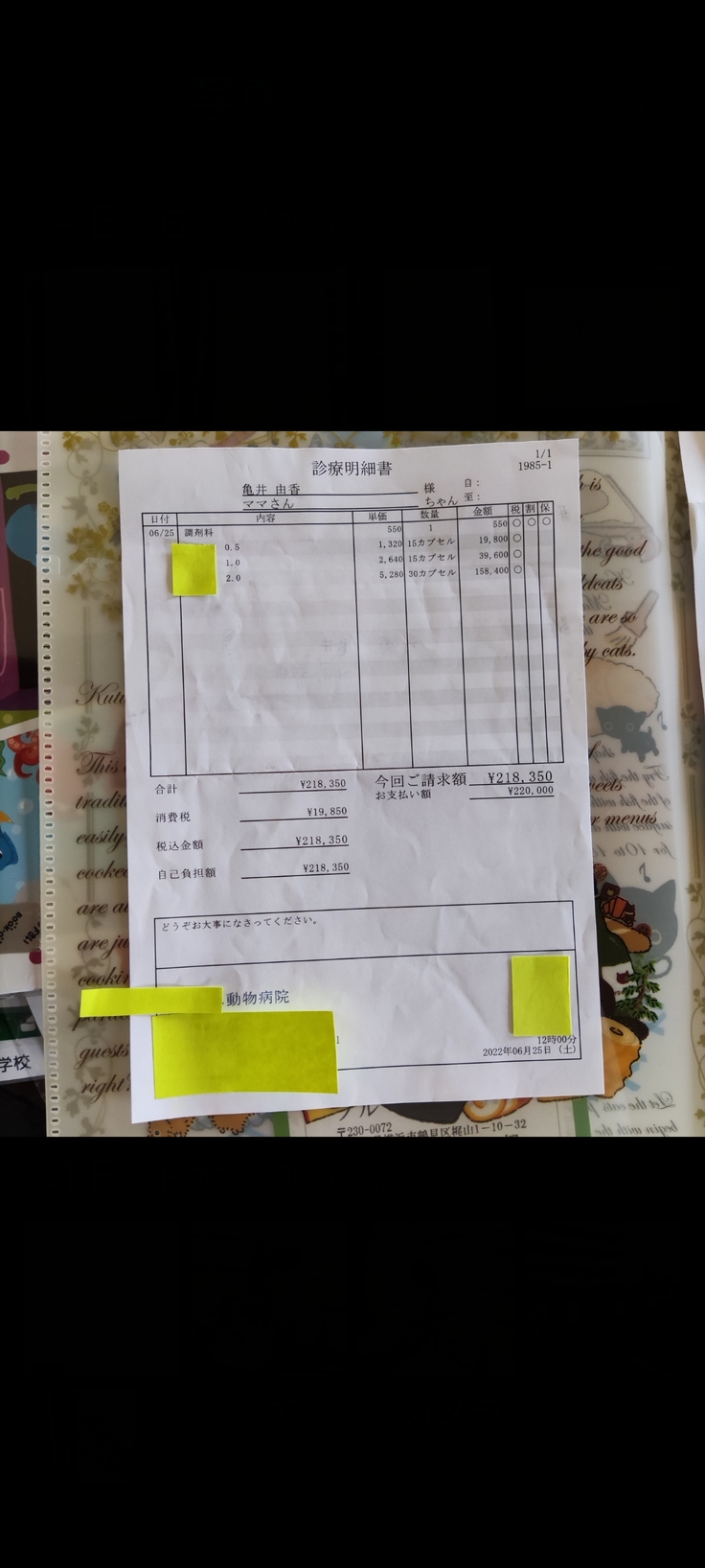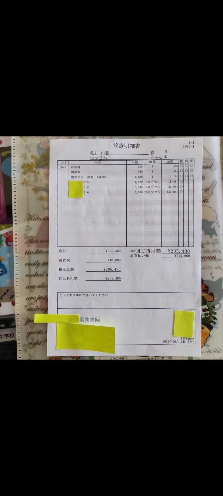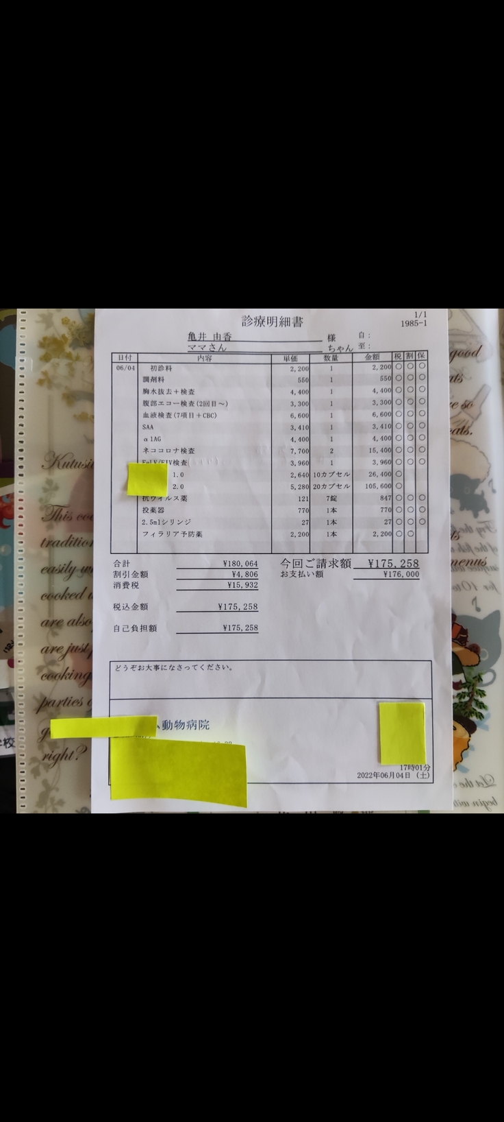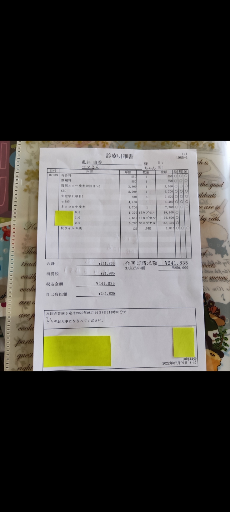 必ず茶白ママさんFIP投薬84日間(8月26日最終)の治療を受けさせ..再発防止に努めます。 ご寄付としていただいた資金は..これまでFIPママさんの治療費のみにかかった分に充てさせていただきます. 常にギリギリの状態です。 6月 4日 10日分 175.258円 6月11日 14日分 205.480円 6月25日 15日分 218.350円 7月 9日 15日分 241.835円 7月23日 15日分 220.165円 ここまで69日分合計 1.061.088円 残り 15日分 投薬 1日 14.520円☓15日分 217.800円 その他検査 血液検査 腹部エコー検査 ネココロナ検査 必要検査等に約3万 総額必要費用 1.300.000円 目標金額 800.000円