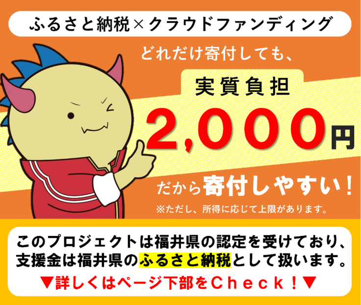 本プロジェクトは福井県の「ふるさと納税を活用した新事業創出支援事業」に認定されたプロジェクトであり、ご寄附者様の個人情報は、福井県に提供されるほか、福井県を通じて本事業者にも提供されます。この点をご了解頂いたうえで、ご寄附をお願いいたします。