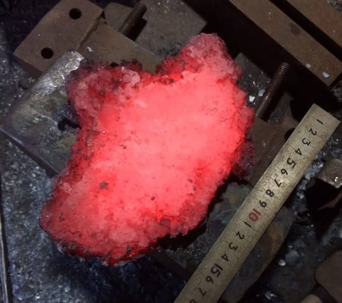 そこで出てくるのがたたら製鉄後に行う作業の一つである卸金(オロシガネ)という技法です。この技法はたたら製鐵でできた鉄をもう一度高温にさらし、硬さの重要要素である炭素量を調整しながら丁度よい材料に整える作業になります。この卸金にはもう一つできることがあります。「現代和鋼」を精製できるということです。これは鉄の包丁の端材を細かく切ったものや旋盤屑など鉄の小さい屑から玉鋼のようなものを作る事ができます。たたらでできた玉鋼は貴重であり練習には使えないため、現代和鋼でまずは包丁や鉈などの作品を製作しつつ鍛練技術を身に着けていきます。