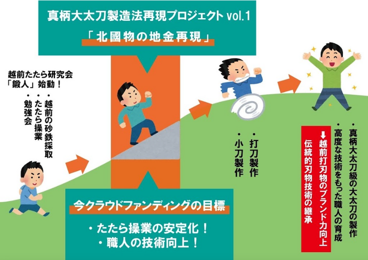 令和5年度 日本刀の製作に本格的にスタートできるように進め、北陸新幹線の開業時に産地にて真柄大太刀製造法再現に向けてのプロセス部分や途中経過を展示し完成まで目が離せないプロジェクトとしてPRします。