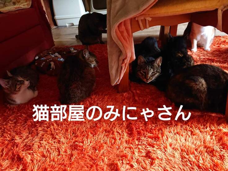 (↑猫部屋の風景。瀕死状態にあった元センター収容猫たちが治療を頑張ってきて、マッタリ過ごす今の姿です。ちなみに家具も敷物もゲージ等これまで沢山ご支援頂けて快適に過ごせております。)
