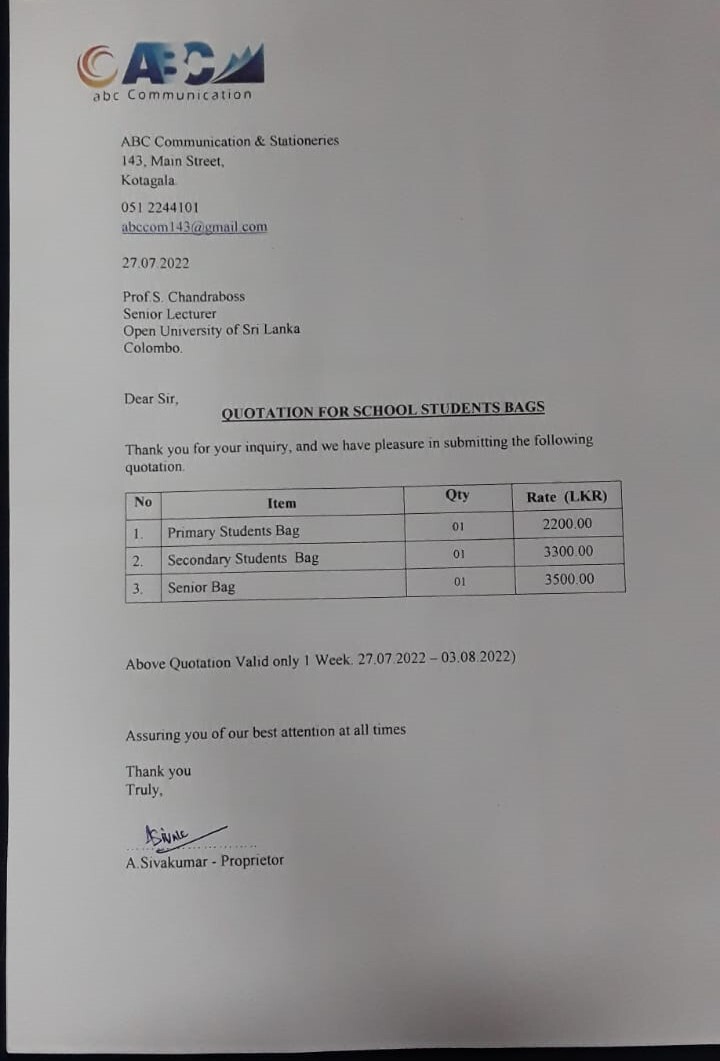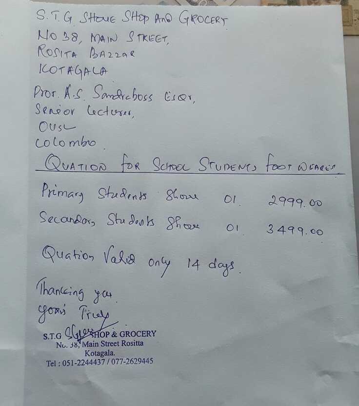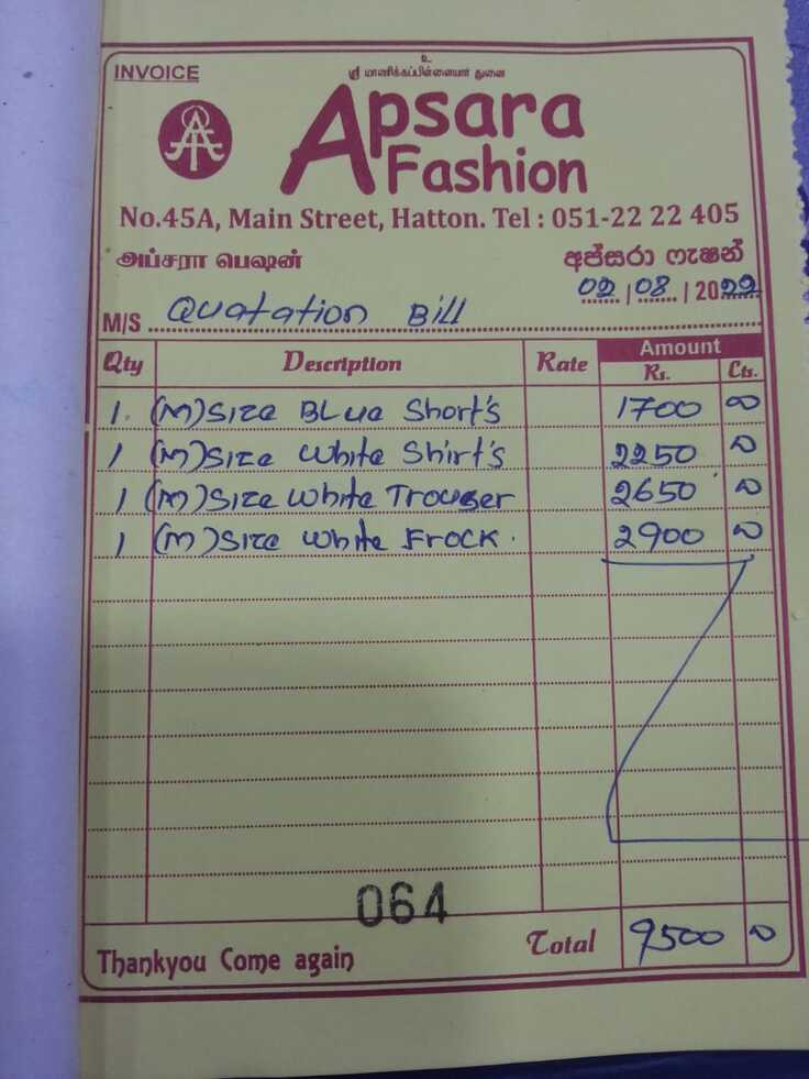 プライマリー(1~5年生)、セカンダリー(6~11年生)、ハイスクール(12、13年生)と、学年によって値段の違いがあり、また男女の制服で金額に差がありますが、全て平均して1人当たり、制服と靴だけで2178円(2022年8月3日のレート 1スリランカルピー=0.3625円)です。カバンの平均は1人当たり1087円(同2022年8月3日のレート)ですが、これに更に1年分の文房具等を贈る予定です。(2022年8月3日追記)