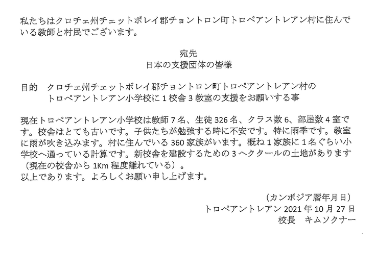 国際社会への様々なボランティア活動を模索する中で、当クラブでの活動を通じて知り合った支援を行なっている交流団体を通してカンボジアの小さな村の小学校校長からメッセージを受け取りました。