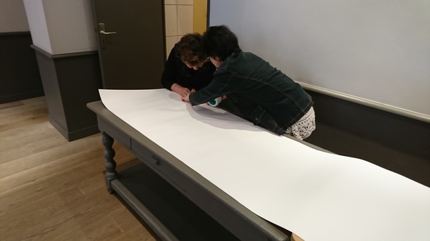そして今日(3月18日)はいよいよアニメ無念の第1回目の上映会だ。午前中は全員で会場に飾るバナー看板の制作、DVDの準備をホテルのレストランを借りての準備作業。その合間に地元テレビ局の取材が入ってくる。取材を受けるのはつたえ隊の岡さんだ。