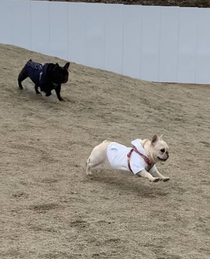 年齢は3歳でクリームがきなこちゃん。女の子で犬よりも人の方が好きで誰にでもすり寄って行きます。ブリンドルの方も女の子であんこちゃんと言います。性格はちょっときつくてスイッチが入れると直ぐに突っかかっていっちゃいますが2匹とも可愛大切な家族です。