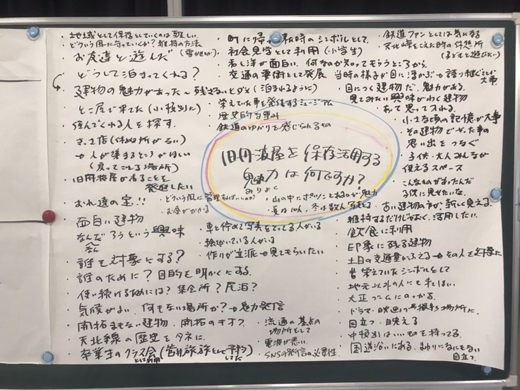 上の画像はその時のワークショップにて、参加いただいた中頓別町内の皆さまからいただいたご意見です。「旧丹波屋旅館を保存活用する魅力は何ですか?」との質問に対し、旧丹波屋旅館に対する思い出を交えながら、様々なご意見を頂戴しました。