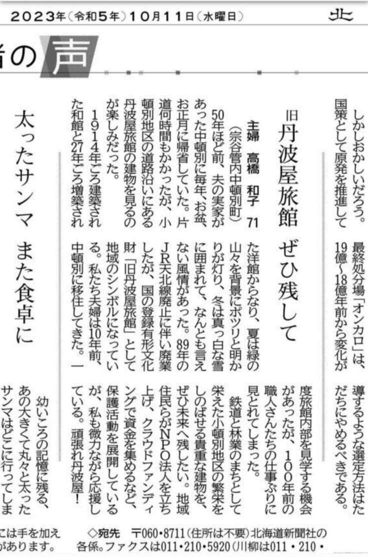 今朝の北海道新聞様「読者の声」欄に、旧丹波屋旅館の記事が取り上げられました。