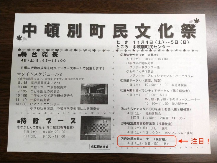 あと6日!11/4,5 中頓別町民文化祭に「丹波屋旅館コーナー」が設置されています!