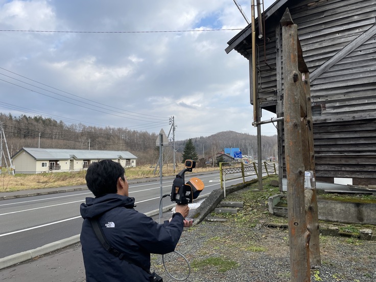 写真のように、まずはスキャニング機器を手に持って、調査対象である旧丹波屋旅館の建物まわりをぐるっと回ります。