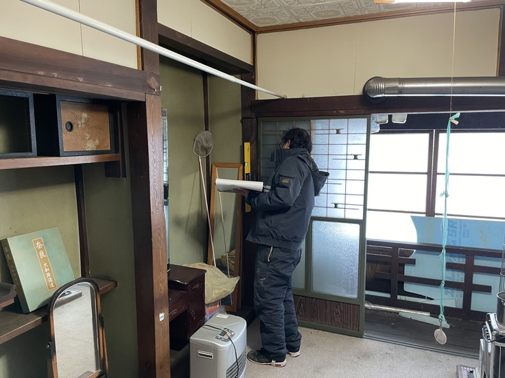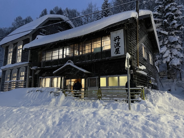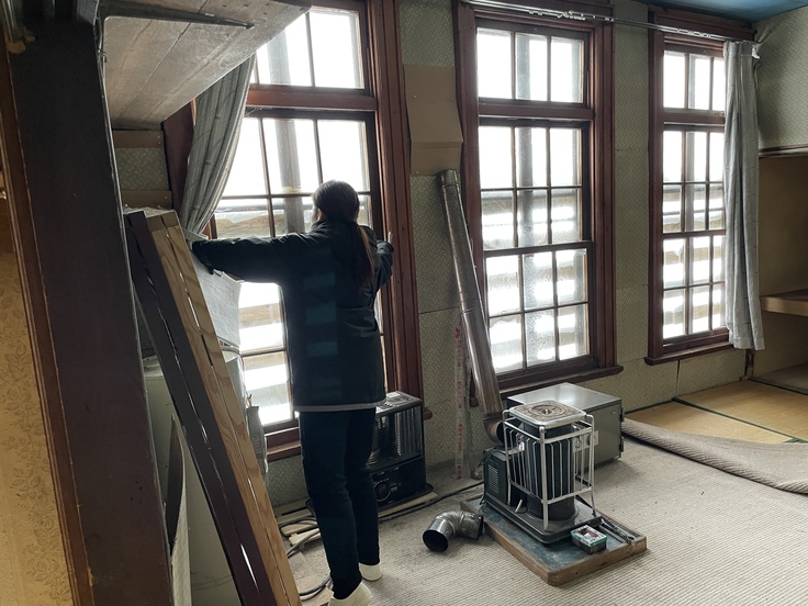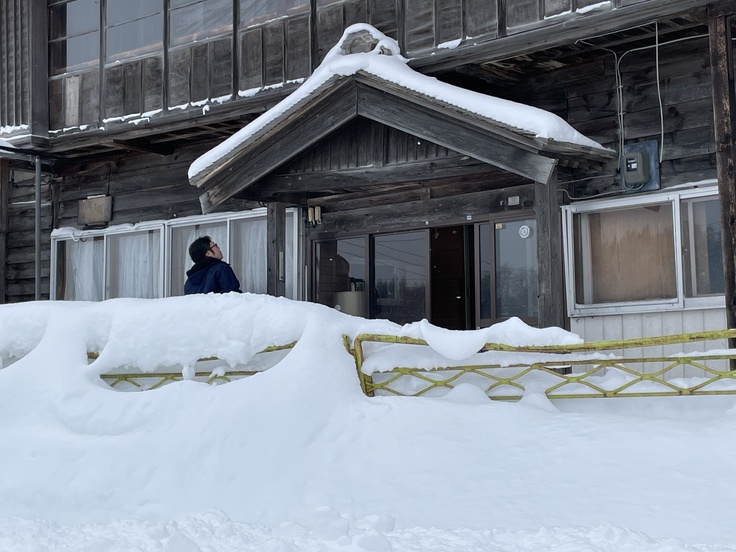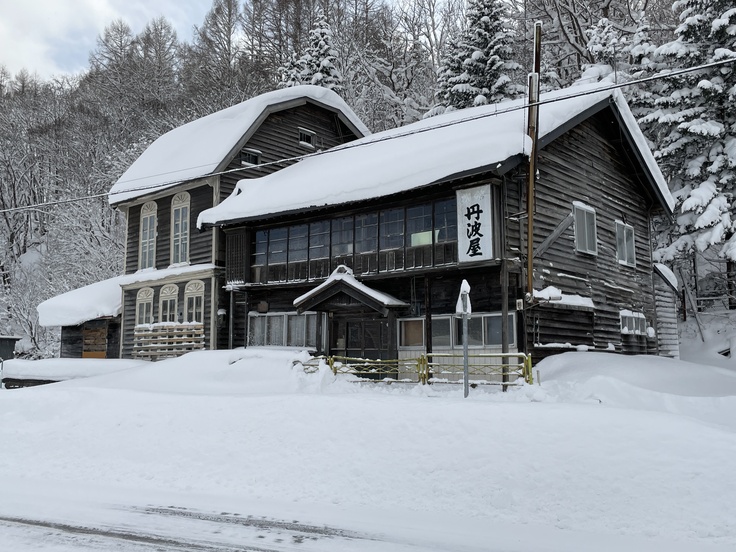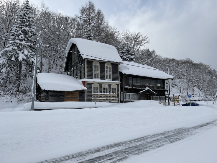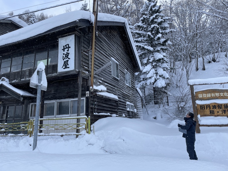 写真のとおり、旧丹波屋旅館のある中頓別町小頓別はすっかり雪景色となっております。19日(火)の朝には、中頓別町の今期の最低気温にあたる最低気温-23.5度を記録しました。また、3日間にわたり天候も芳しくなく、時折吹雪に見舞われながらの調査実施となりました。気温が低いこともあり、雪自体は軽めです。水分を含む重い雪が建物の屋根に積もると、余計な荷重がかかるので、建物の倒壊を心配してしまいます。その面では、軽い雪質であることは、少し安心になります。