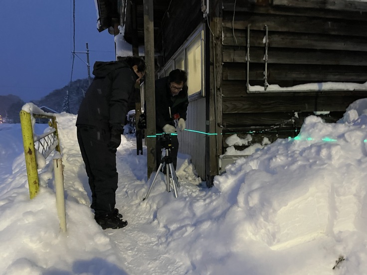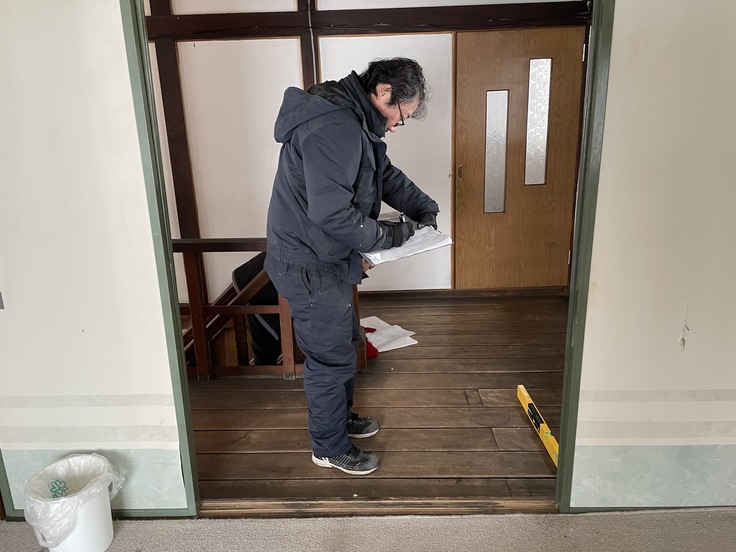3日間の調査を完了しわかったことは、建物正面からみて全体的に左側へ建物が傾いていることが数値的にも確認出来ました。ここ数年傾きが顕著に見え懸念しておりましたが、数値的にも実証されたかたちになります。この冬も何とか雪に耐えてほしいと願うばかりです。