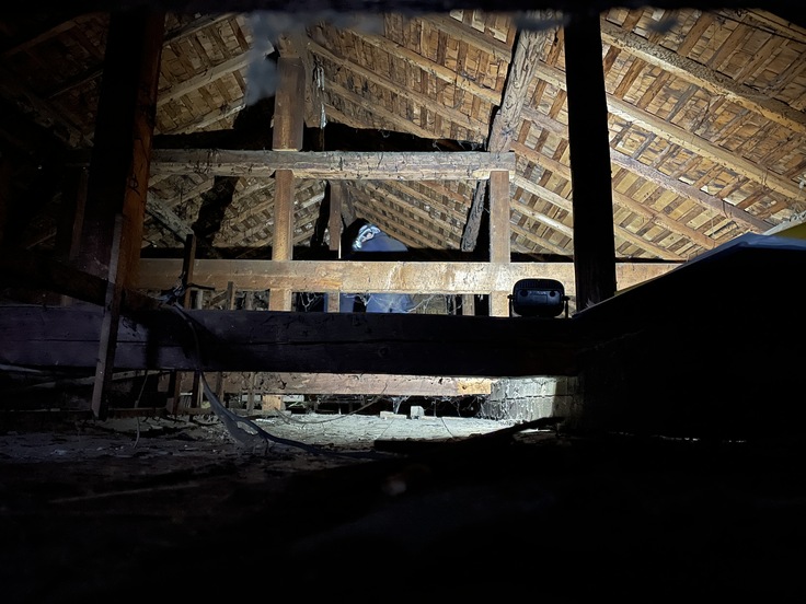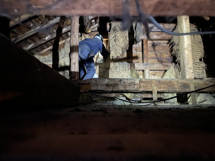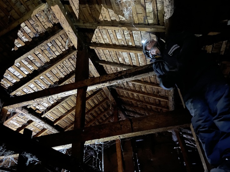 建物の構造を確認するために、小屋裏(屋根裏)にも入り、部材の寸法や状況について確認を行いました。