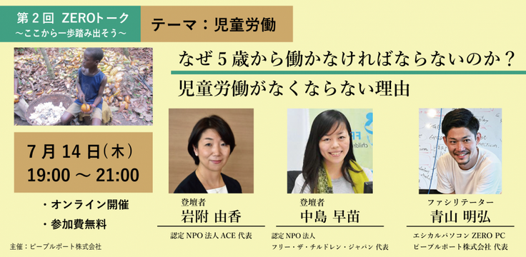 難民ゼロを目指すエシカルパソコン「ZERO PC」を販売するピープルポート株式会社のトークイベント「ZEROトーク」に、ACE代表の岩附が登壇します。フリー・ザ・チルドレン・ジャパン代表の中島早苗さんと一緒に、児童労働についてお話しします。