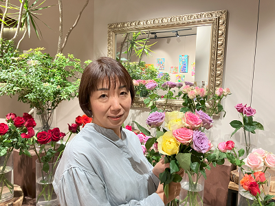 インド在住の岩附が日本に一時帰国するタイミングで、AFRIKA ROSEの六本木ヒルズの店舗に伺い、バラの色や種類、ラッピングペーパーからリボンの色に至るまで、細かく花束のイメージを決めていきました。田中さんも相談に乗ってくださり、いろいろとアイデアを出していただきました。