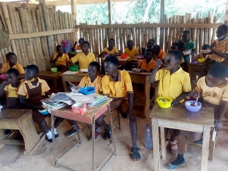 ガーナでは新型コロナウイルスの感染拡大の影響で公立の小学校が閉鎖した時期もありましたが、再開後の2021年1月から、支援する2つの村の小学校で給食支援を行いました。プロジェクトで支援したのは一週間のうち3回(月、水、金曜日)ですが、残り2回(火、木曜日)は保護者がお金を出し合って実施する形になっています。