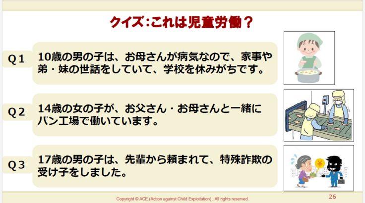 Q2:児童労働にあたります。14歳は、まだ働いて良い年齢ではありません(「最低年齢条約」で定められています)。