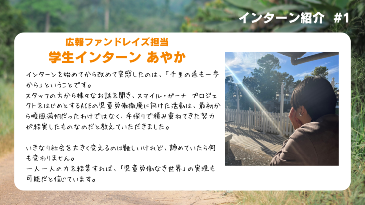 インターンからのメッセージ~一人一人の力を結集すれば、「児童労働なき世界」の実現も可能!