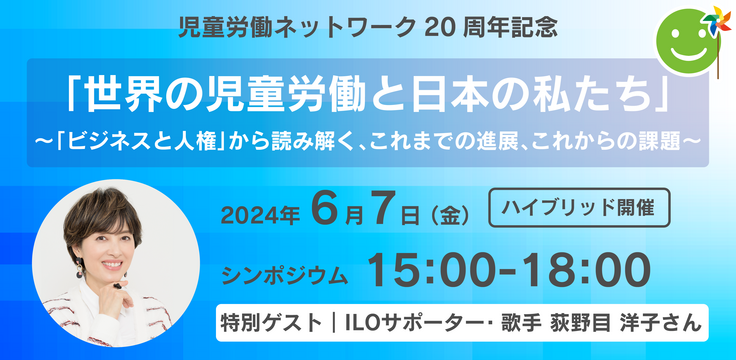 また、特別ゲストとしてILOサポーターで歌手の荻野目洋子さんをお迎えし、児童労働ゼロに向けたご自身の取り組みや想いについてもお話を伺います。
