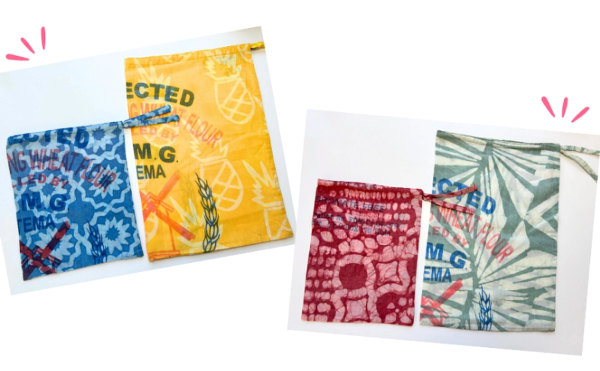●小麦が入っていた袋をアップサイクルし、バティックで染めた巾着です。アフリカの女性たちが伝統的な手法を用いて手作りしています。