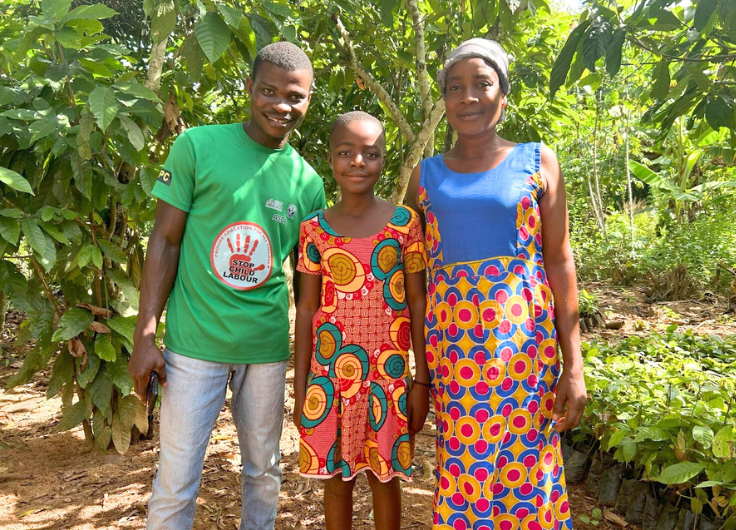 ヘレンさん(仮名・写真中央)は、カカオ農園で働いているのを住民ボランティア(写真左)が見つけたのがきっかけで、毎日学校に通うようになりました。将来の夢は「医者」になること。病気のお母さんを診てあげたいのだそうです。