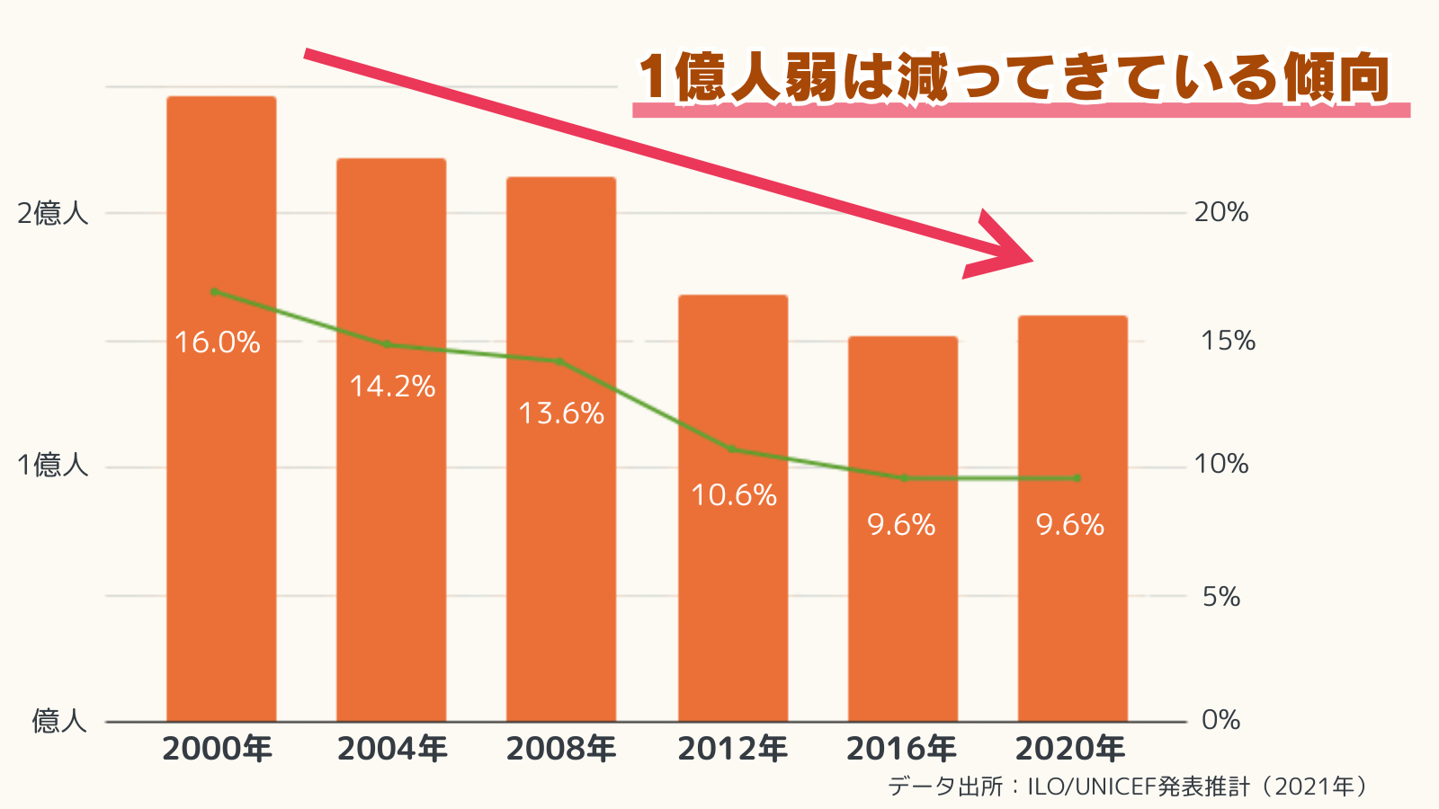 児童労働をなくすために、これまで世界中でさまざまな取り組みがなされ、この20年で1億人弱は減ってきている傾向にありますが、SDGsに記載された「2025年までにすべての形態の児童労働を撤廃する」という目標の達成は極めて厳しい状況です。