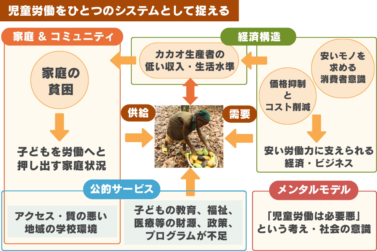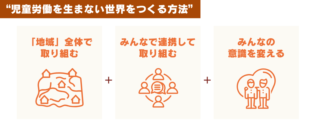 たとえば、カカオ農園で危険な労働をする目の前の子どもを救ったとしても、その後、同じ地域にある金鉱山で働くことになったとしたら、児童労働が解決されたとはいえません。