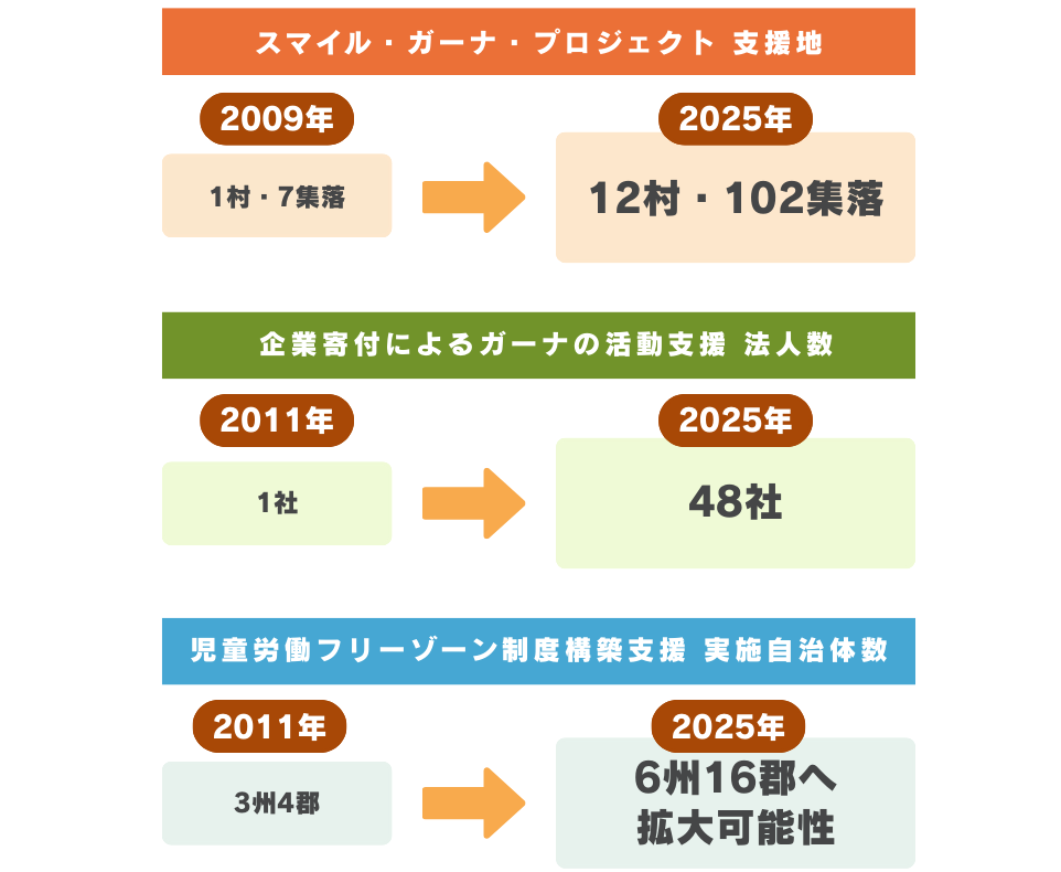 草の根から始まった活動は今ではガーナ政府との取り組みにまで発展し、ガーナ政府が国家計画の一環として進めている 「児童労働フリーゾーン ( Child Labour Free Zone )」認定制度の構築に協力しています。
